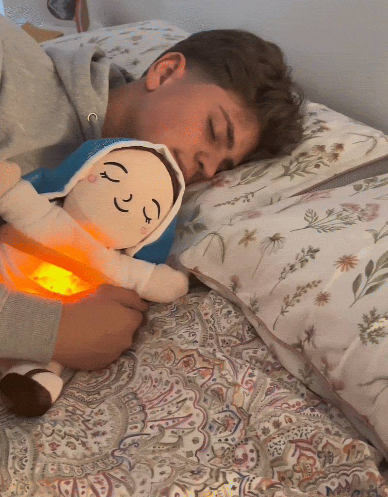 CuddleMary™ instantly soothes your anxiety, quiets your mind, and fills your night with gentle spiritual comfort.Her calming breath, warm Sacred Heart glow, and soft embrace help you switch off even on your most overwhelming nights.
